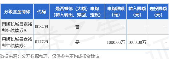 本站消息,9月26日景顺长城基金管理有限公司发布《关于景顺长城景泰裕利纯债债券型证券投资基金C类基金份额限制壹仟万元以上申购及转换转入业务的公告》。公告中提示,为保护基金份额持有人利益,保障基金平稳运作,自2025年9月29日起景顺长城景泰裕利纯债债券型证券投资基金C类基金份额限制壹仟万元以上申购及转换转入业务,申购、转换转入上限金额为1000.0万元,下属分级基金调整明细如下: